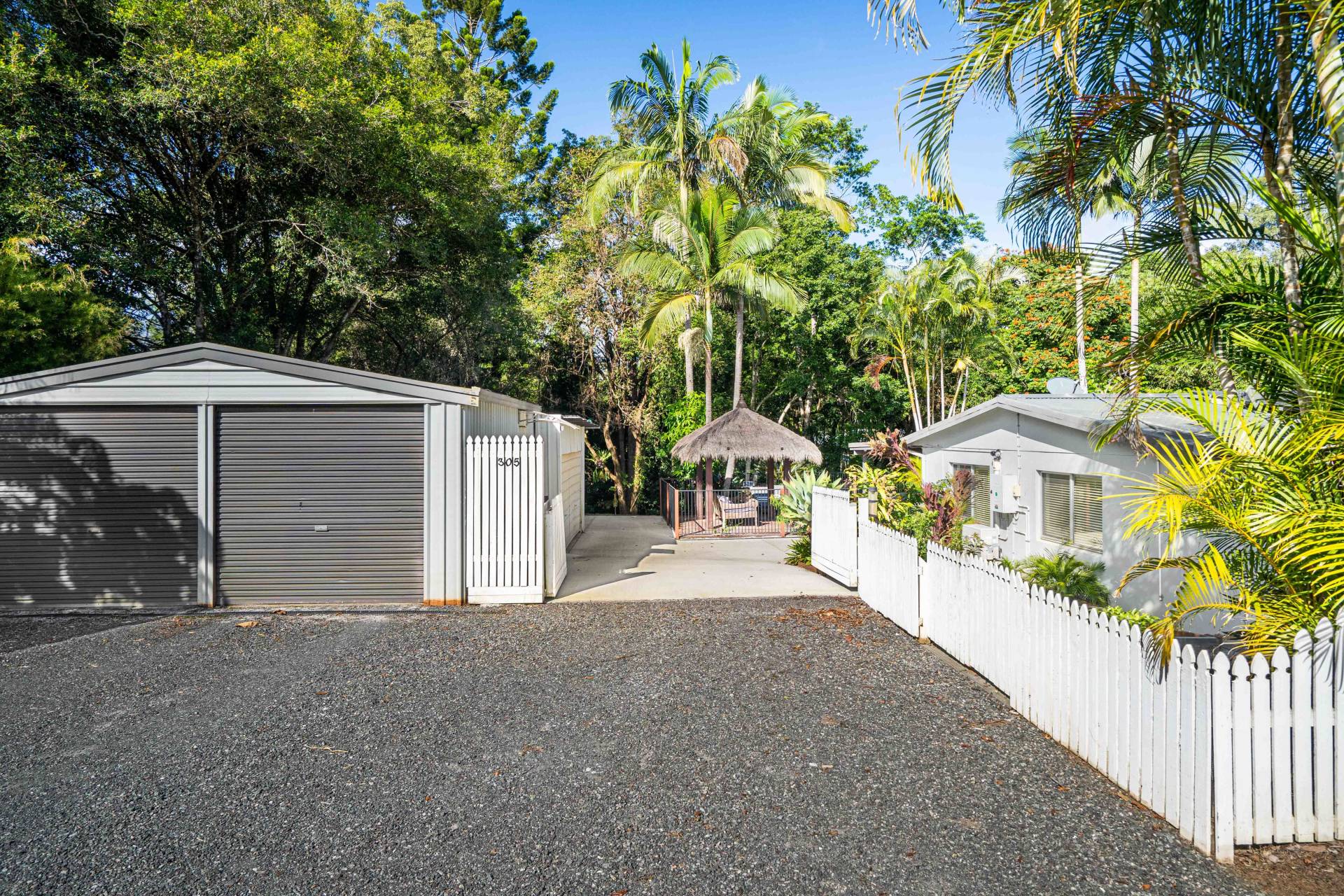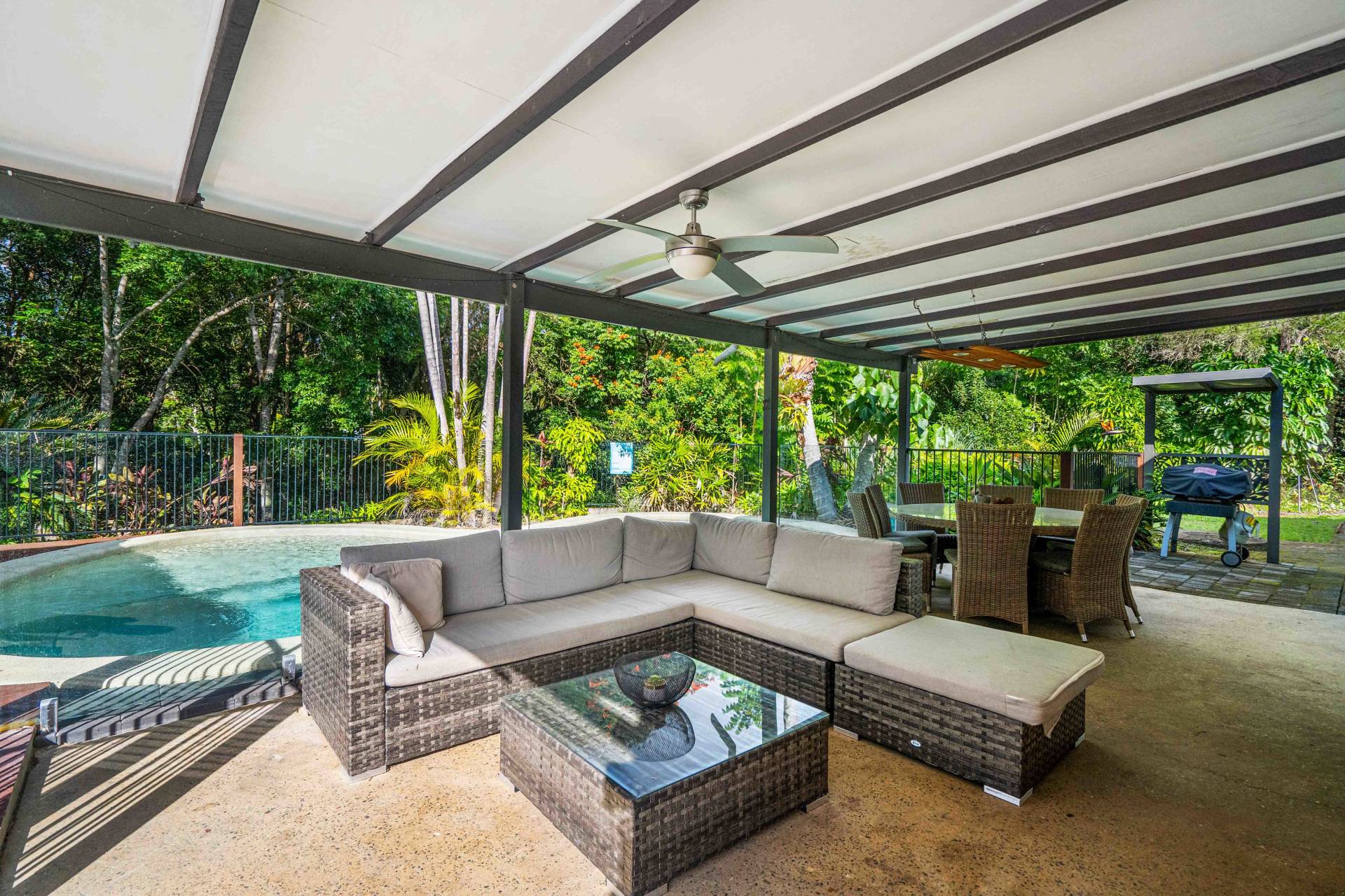 Huge swimming pool, lush rainforest backdrop and great multi-functional shed.