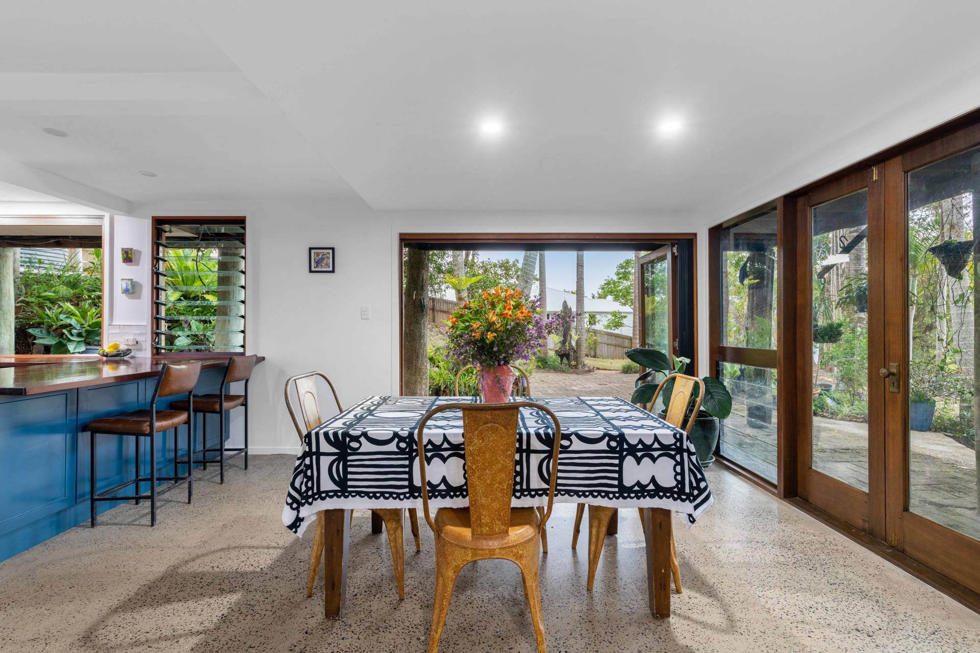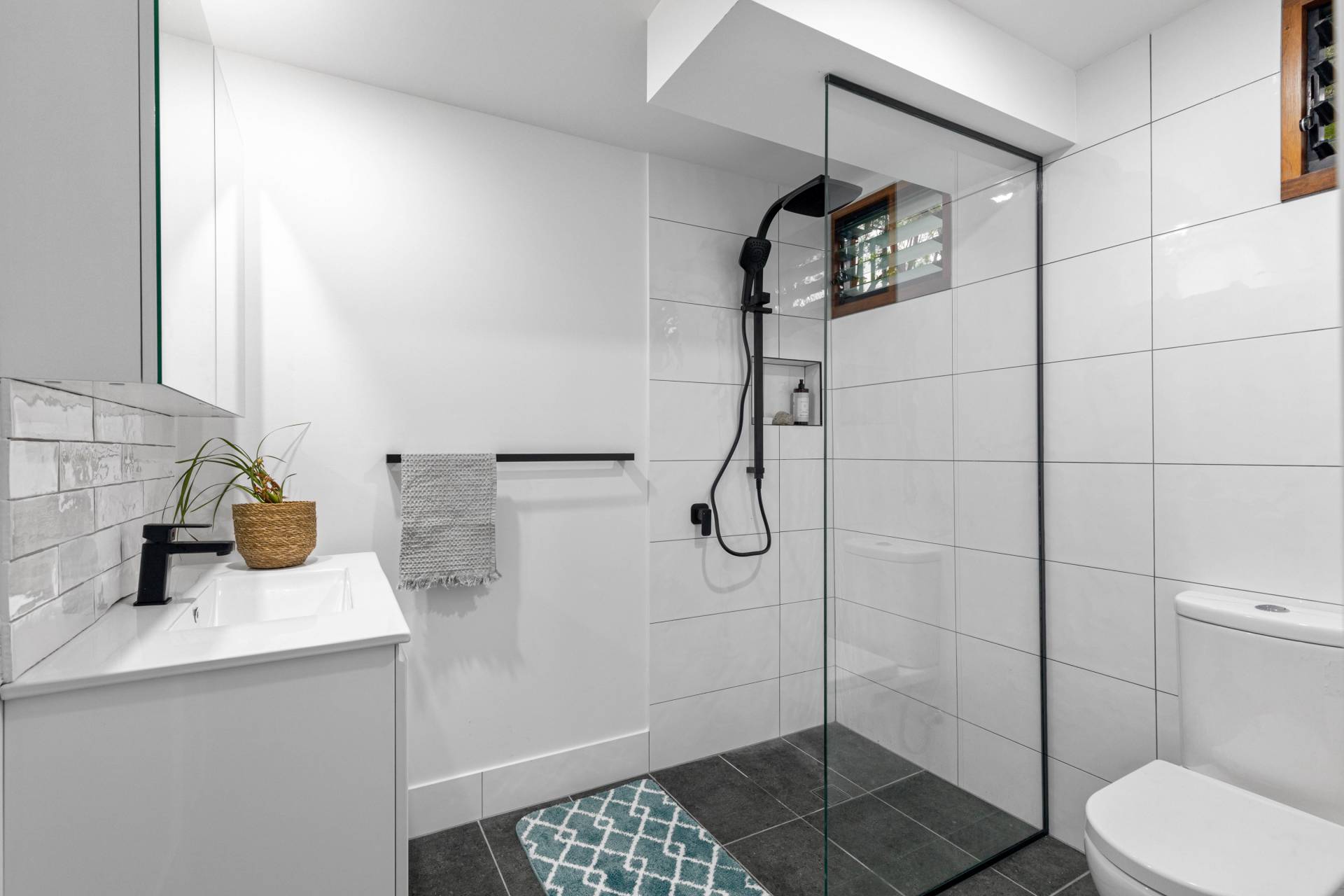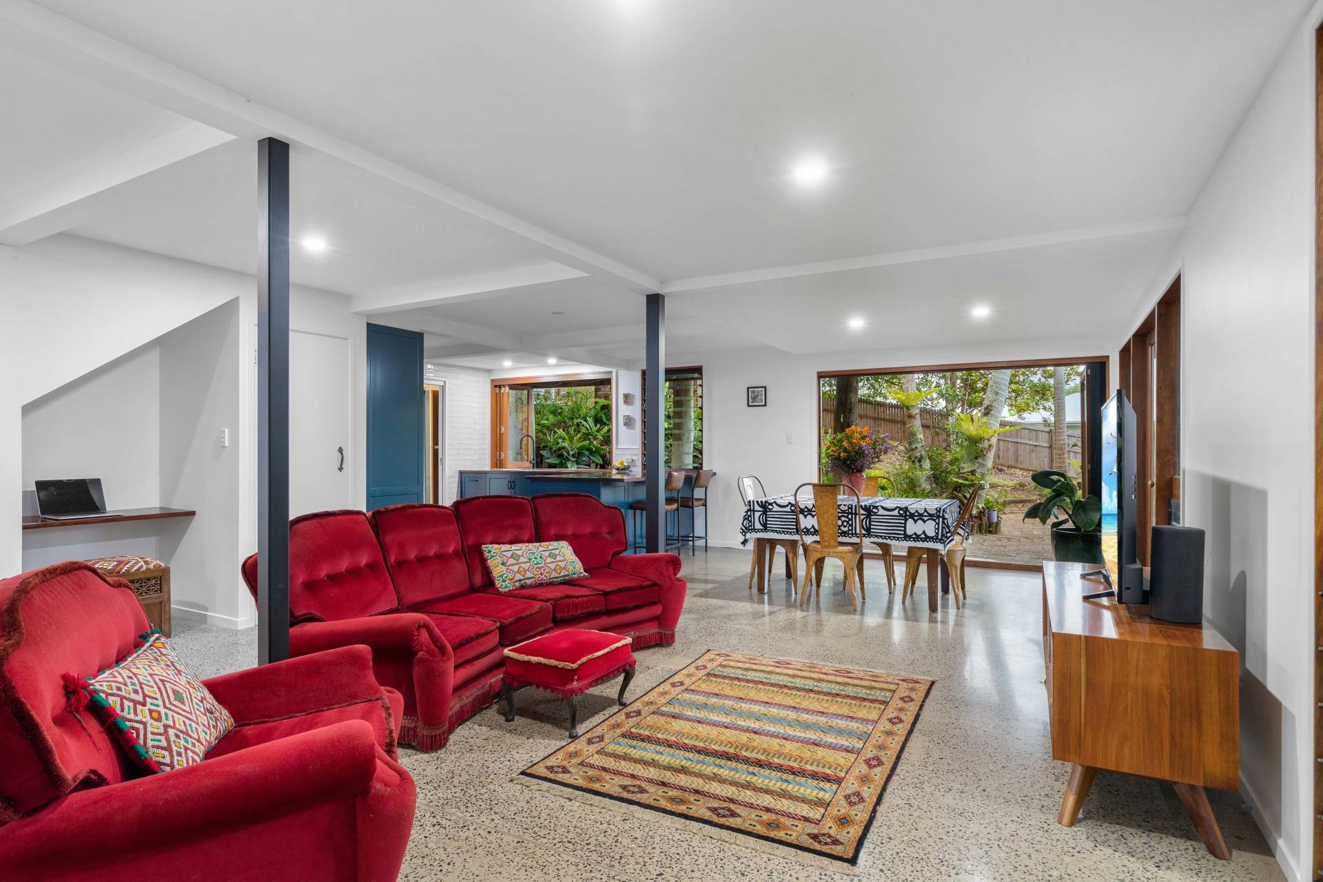 Downstairs has been tastefully and comprehensively renovated, and comprises gorgeous new kitchen, stylish new bathroom, open plan living and dining with polished concrete floors and bay window with built-in seat, built-in study nook under staircase, separate laundry, and wraparound paved terrace – perfect for BBQ’s after a morning at the beach.
